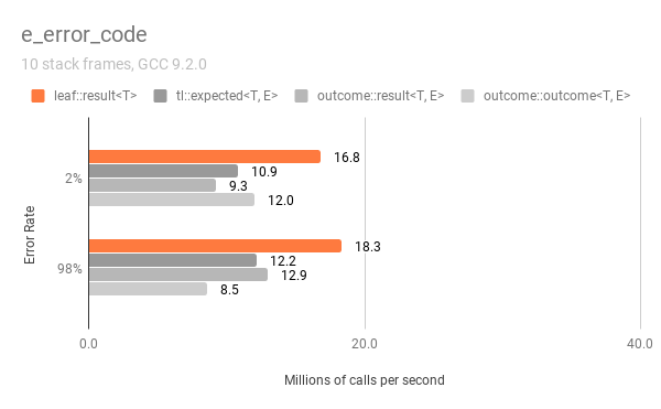 The LEAF github repository contains two similar benchmarking programs, one using LEAF, the other configurable to use tl::expected or Boost Outcome, that simulate transporting error objects across 10 levels of stack frames, measuring the performance of the three libraries.